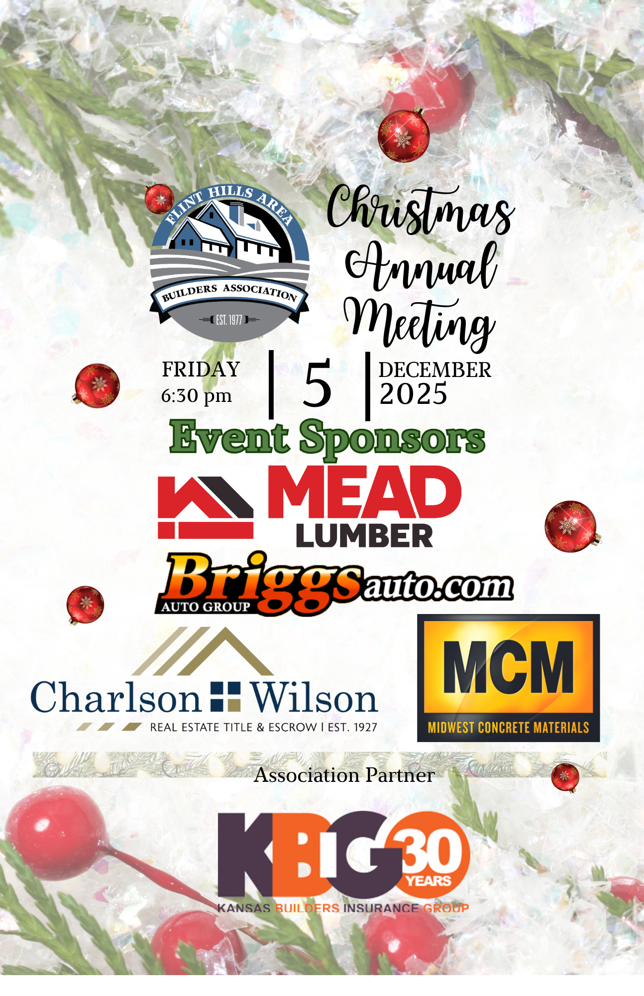 Annual Membership Meeting Friday, December 5, 2025 6:00 PM 10:00 PM 18:00 22:00 Flint Hills Area Builders Association 216 South 4th Street Manhattan, KS, 66502 United States (map) Google Calendar ICS Registration closes December 1stClick here to REGISTER